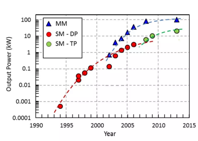 圖高功率包層抽運(yùn)的摻Y(jié)b3+光纖激光器的功率提升。圖中同時涵蓋了多模光纖激光器(MM),二極管直接抽運(yùn)(SM-DP)激光器和同帶級聯(lián)抽運(yùn)(SM-TP)的激光器功率提升情況。