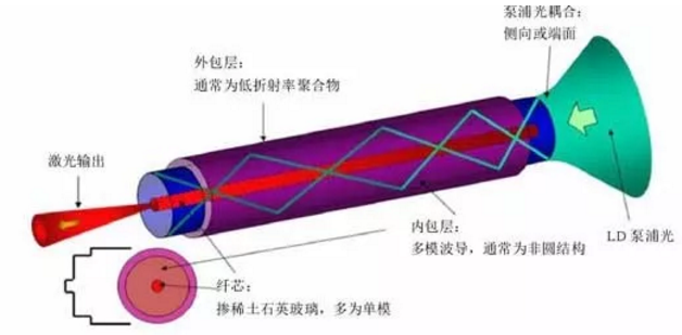 1988年,雙包層光纖出現(xiàn),使光纖激光器的輸出功率得到明顯提升。典型的雙包層光纖結(jié)構(gòu)包括纖芯、內(nèi)包層和外包層三部分,外包層折射率低于內(nèi)包層,因此抽運(yùn)光可以在內(nèi)包層中傳輸。內(nèi)包層的直徑和數(shù)值孔徑可遠(yuǎn)大于纖芯,便于高效耦合抽運(yùn)光。抽運(yùn)光在內(nèi)包層里經(jīng)多次全反射后,進(jìn)入摻稀土離子的纖芯被吸收,實(shí)現(xiàn)激光的產(chǎn)生或放大。包層抽運(yùn)技術(shù)的出現(xiàn)使光纖激光器輸出功率實(shí)現(xiàn)了由毫瓦級到瓦量級的提升。