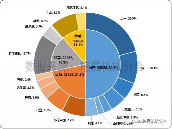 2017年國(guó)產(chǎn)、日系、歐美和韓系品牌銷量分別為65585、28028、22082和14864臺(tái),市場(chǎng)占有率分別為50.2%、21.5%、16.9%和11.4%。三一、卡特彼勒和徐工占據(jù)國(guó)內(nèi)市場(chǎng)前三位。