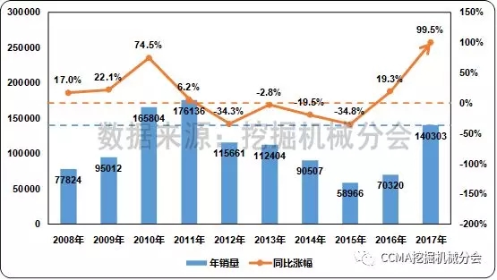 圖1 近十年中國(guó)挖掘機(jī)械市場(chǎng)同期銷量及同比變化情況