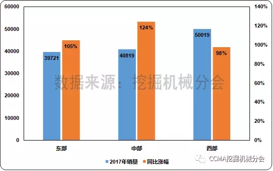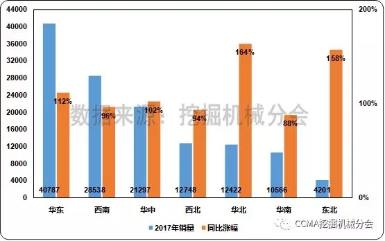圖4 2017年不同地區(qū)挖掘機(jī)械銷量和同比變化情況2