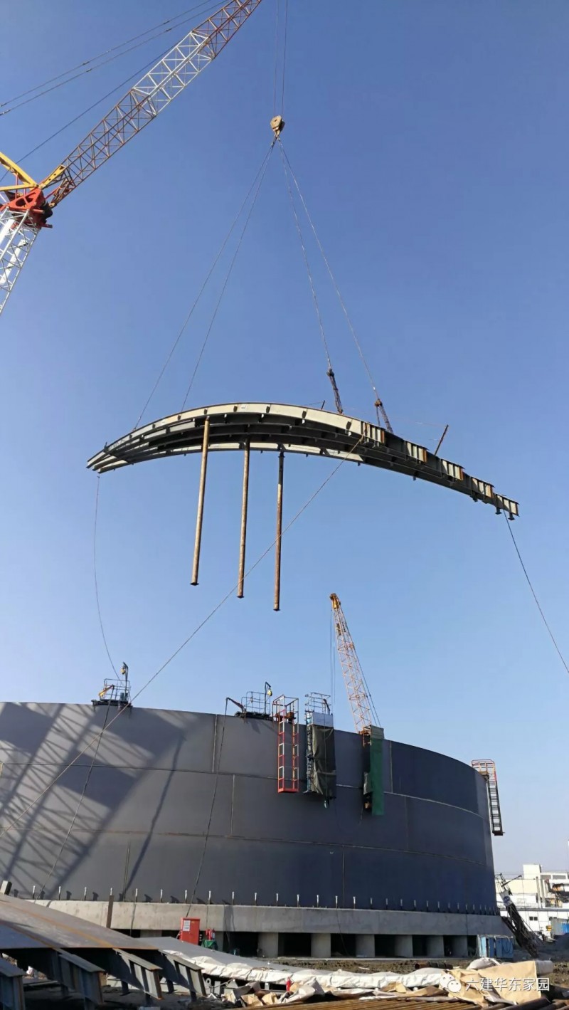 1月10日,伴隨著260噸履帶吊車的轟鳴聲,中油六建華東分公司江陰LNG項(xiàng)目部T-1201儲(chǔ)罐拱頂塊第一塊吊裝成功,為下一步拱頂組裝得以順利實(shí)施創(chuàng)造有利條件。