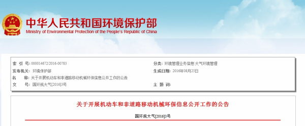 環(huán)保部《關(guān)于開展機(jī)動車和非道路移動機(jī)械環(huán)保信息公開工作的公告》