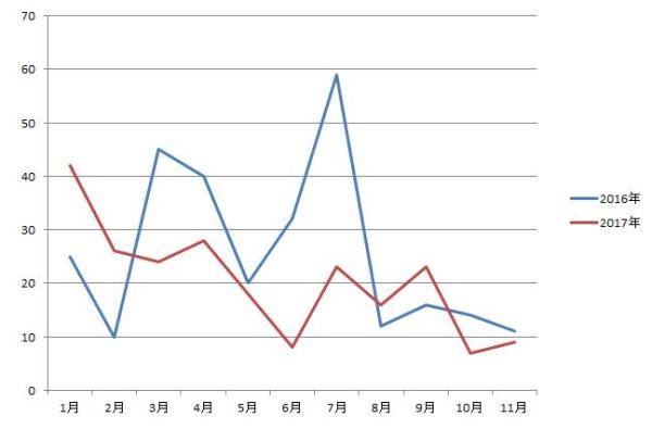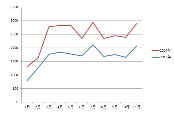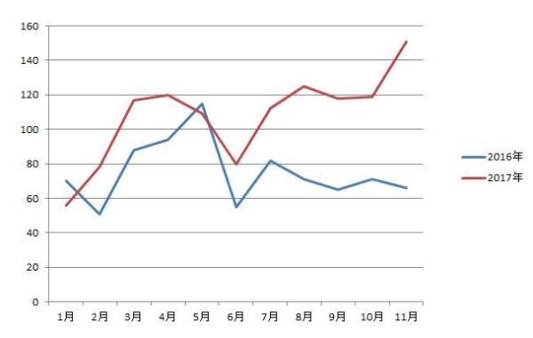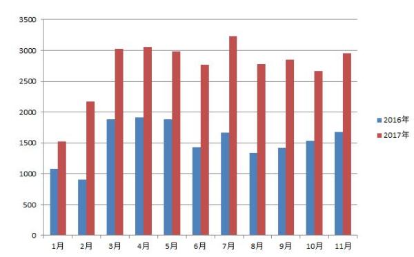 2016-2017年1-11月起重機銷量對比圖
