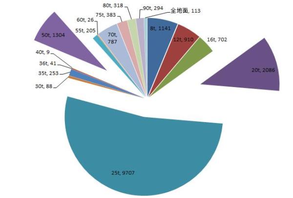 數(shù)據(jù)顯示,汽車起重機中,25t、20t、50t三個噸位起重機銷量最高,占到總銷量的70%以上。