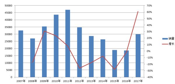 2007年-2017年起重機銷量圖(2017年起重機銷量數(shù)據(jù)為1-11月)