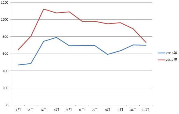 2016-2017年1-11月隨車起重機銷量對比圖