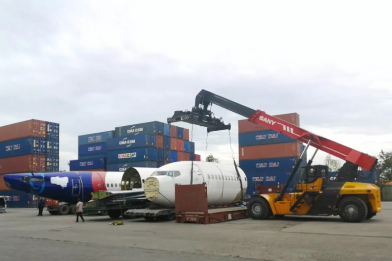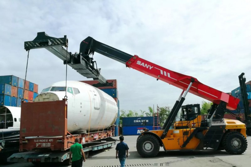 1月5日,印尼東亞堆場(chǎng)迎來(lái)了一次特殊的吊裝項(xiàng)目。那就是將一架波音737拆分后的部件,準(zhǔn)確無(wú)誤地起吊,并固定在特種集裝箱上。擔(dān)當(dāng)這一重要吊裝任務(wù)的起吊設(shè)備正是三一正面吊。