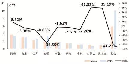 基于此,我們判斷,2018年收獲機(jī)市場(chǎng)或?qū)⒊尸F(xiàn)恢復(fù)性小幅增長(zhǎng)的特點(diǎn),預(yù)計(jì)全年需求量或?qū)⑴腔苍?7萬(wàn)臺(tái)左右,增幅在12%上下。