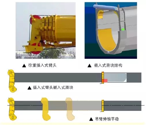 插入式臂頭設計,曾獲得國家專利設計,也是當時行業(yè)唯一一個成熟應用該技術的企業(yè),加長的嵌入式條形滑塊,支撐面積大,降低對內(nèi)節(jié)臂筒體的接觸應力,吊臂承載力更強。