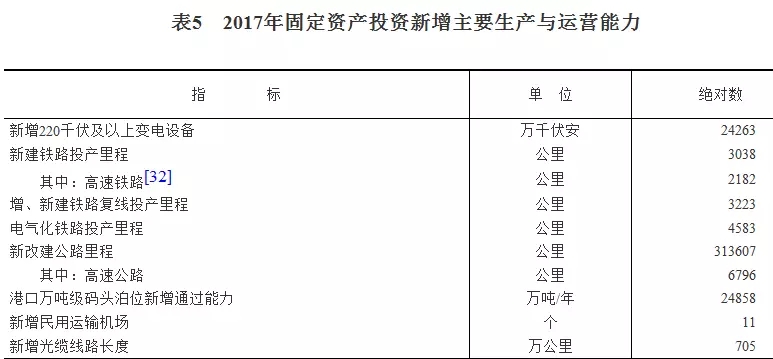 2017年固定資產(chǎn)投資主要集中在電力、鐵路、公路、港口碼頭、機(jī)場等領(lǐng)域。新建鐵路3038公里,其中,高鐵2182公里(2016年為3281公里,高鐵超1900公里),說明鐵路領(lǐng)域建設(shè)投資正在減少,但高鐵勢頭卻在走高。2017年全國新改建公路313607公里相較于2016年的324898公里有所減少。2017年新增民用運(yùn)輸機(jī)場8個(gè),和2016年持平。