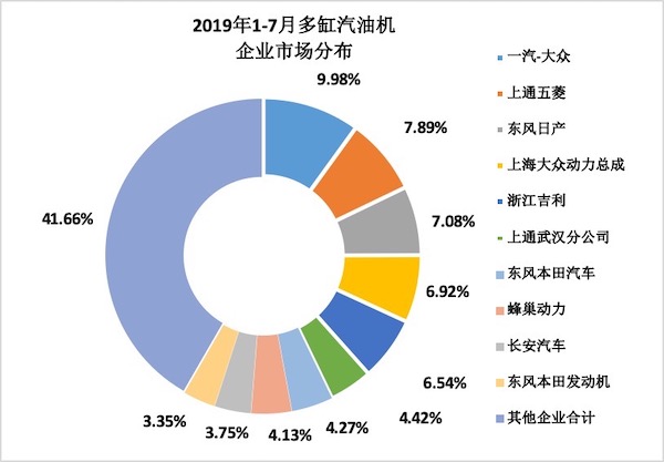 國(guó)六標(biāo)準(zhǔn)切換,乘用車市場(chǎng)銷量縮水產(chǎn)量下調(diào),多缸汽油機(jī)市場(chǎng)下行壓力較大。受其影響多缸汽油機(jī)7月銷量環(huán)比小幅上升、同比繼續(xù)下降。7月銷售140.90萬(wàn)臺(tái),環(huán)比增長(zhǎng)5.51%,同比增長(zhǎng)-15.83%,累計(jì)銷量1025.90萬(wàn)臺(tái),同比增長(zhǎng)-18.87%。在55家多缸汽油機(jī)企業(yè)中一汽大眾、上通五菱、東風(fēng)日產(chǎn)等十家銷量排在前列,其總體銷量占行業(yè)銷量的58.33%。累計(jì)銷量前十的企業(yè)中,上通武漢、東本汽車同比銷量為正增長(zhǎng),其余均呈現(xiàn)不同程度降幅,降幅較上月均有所收窄。乘用車用在多缸汽油機(jī)占比為97.80%,7月銷售137.49萬(wàn)臺(tái),環(huán)比增長(zhǎng)5.07%,同比增長(zhǎng)-16.61%,累計(jì)銷量1003.34萬(wàn)臺(tái),同比增長(zhǎng)-19.37%。