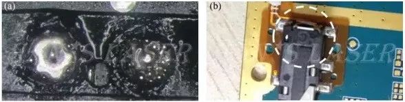 基于激光能量高度集中,錫膏受熱不均爆裂飛濺,濺落的錫珠易造成短路(如圖2(a)),因此對錫膏的質(zhì)量要求非常高,可采用防飛濺錫膏以避免飛濺(如圖2(b))。