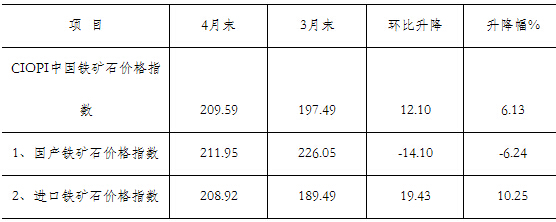 4月份中國鐵礦石價格指數(shù)(CIOPI)由降轉(zhuǎn)升