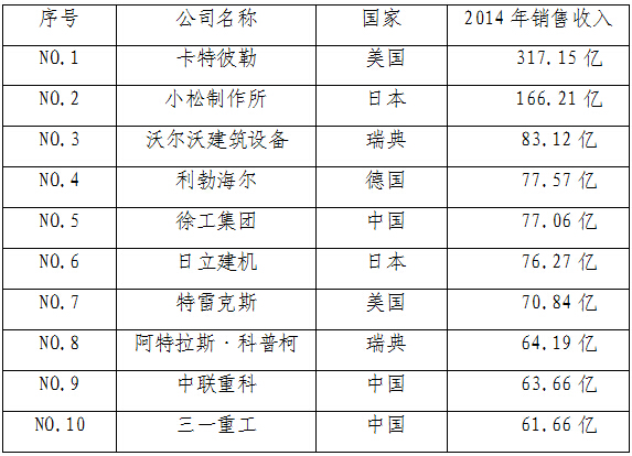 表1 2014全球工程機(jī)械制造商50強(qiáng)前10位 單位:美元